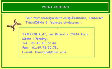 Présentation de TAMAZGHA : TAMAZGHA est une association régie par la loi 1901. Elle est créée en 1993 par un groupe d'étudiants de la section berbère de l'INALCO autour d'enseignants-chercheurs berbérisants. TAMAZGHA se propose de promouvoir et de développer la langue et la culture berbères dans toute leur diversité en axant son activité sur : 1) L'enseignement du berbère sur la base des supports pédagogiques existants ; 2) L'enrichessement du fond documentaire berbère en réhabilitant tous les ouvrages parus et les rendre accessibles ; 3) L'encouragement de toute production scientifique, culturelle et artistique; 4) L'organisation d'expositions, débats et conférences autour de thèmes précis ; 5) La diffusion de l'information relative aux Berbères toutes les fois que l'actualité l'exige. TAMAZGHA se veut une association berbère. Elle uvre pour le rassemblement des différentes composantes berbères et facilite la communication entre elles. Il est donc important que des Berbères appartenant aux différentes composantes la rejoignent.